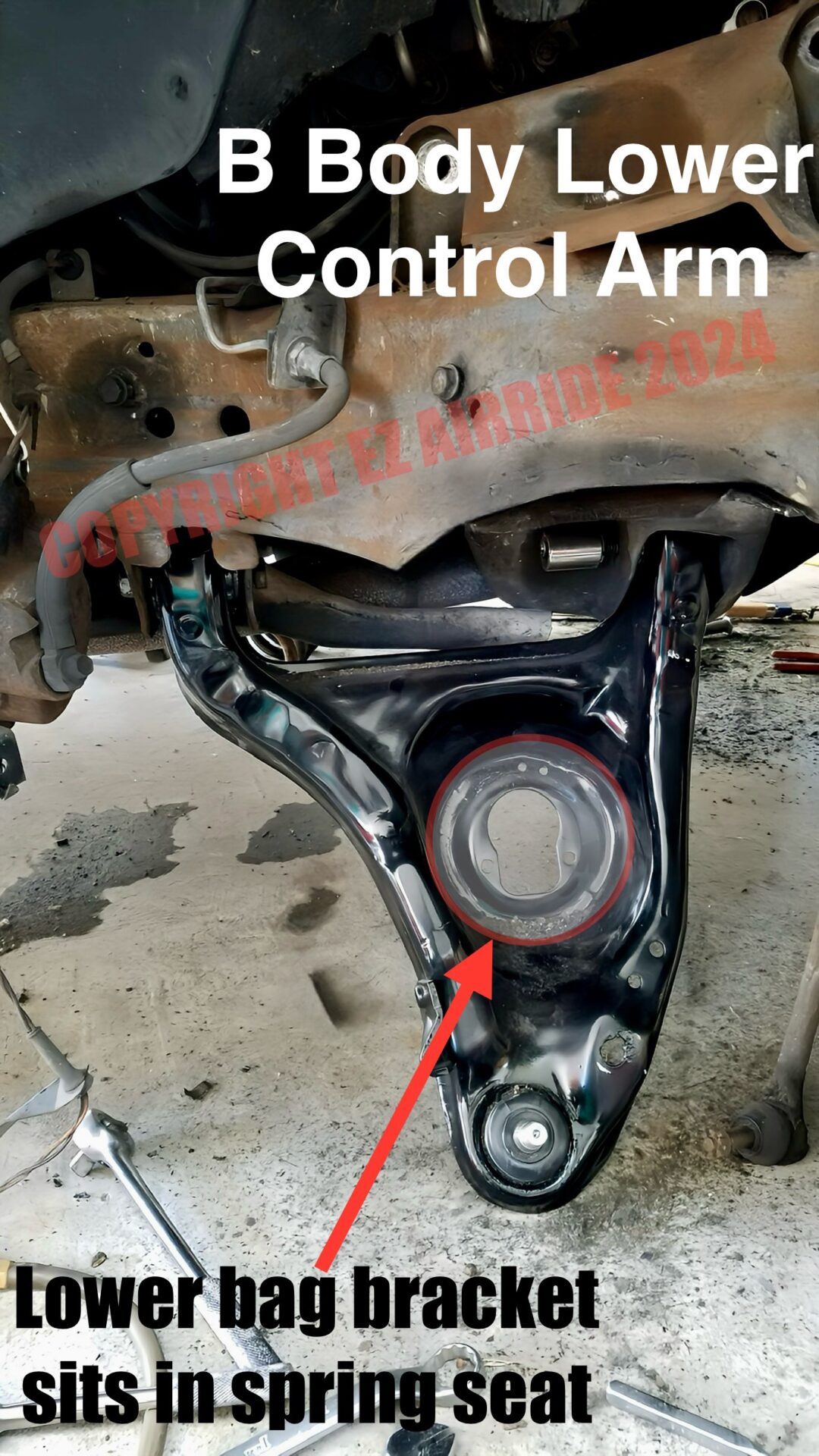 THE LOWER STAINLESS SHOCK BOLTS: Effortlessly bolt through the factory lower control arm. This process involves drilling a hole the same size as the provided stud, typically below the airbag on the backside of the A-arm facing the firewall.