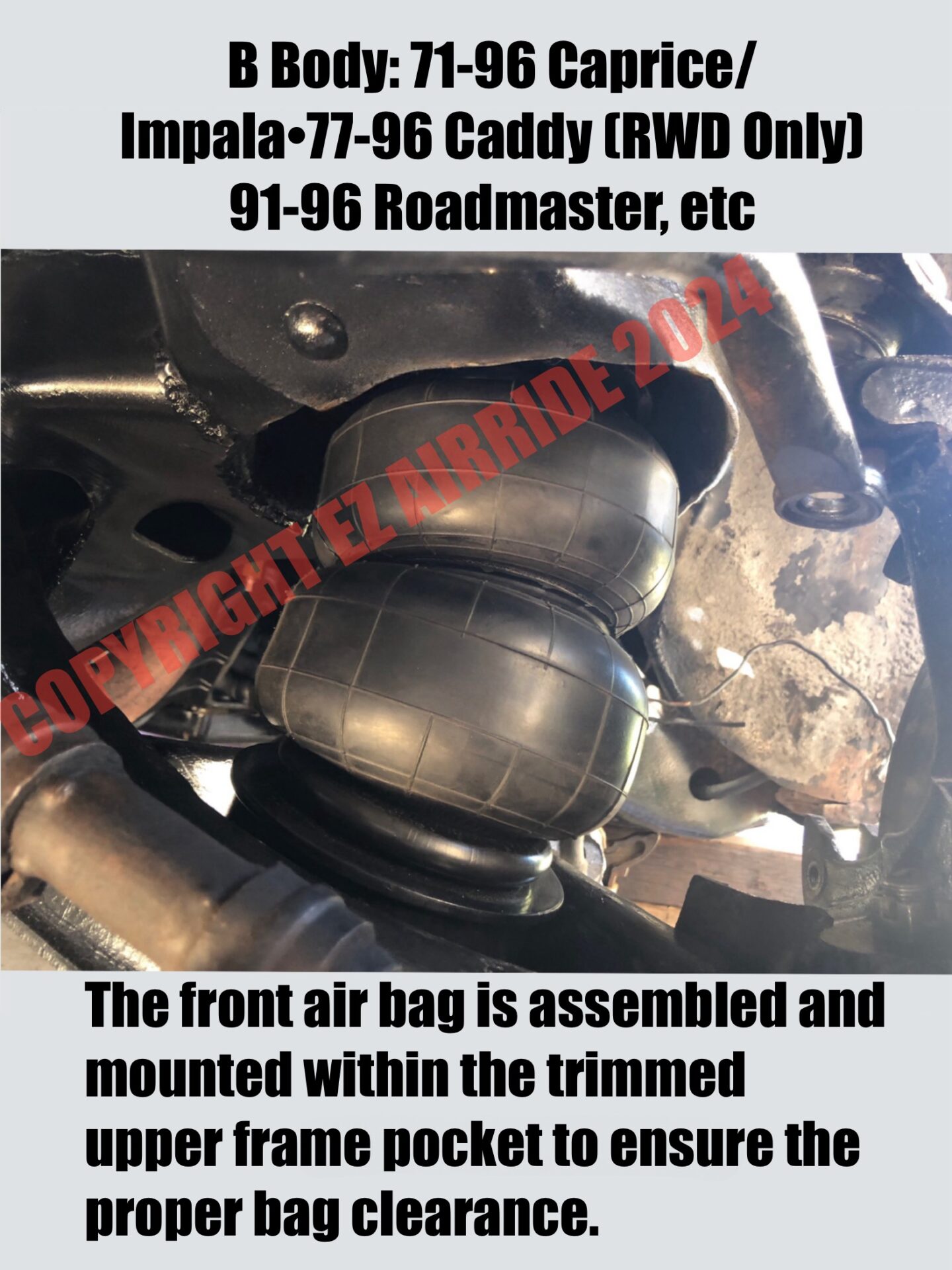 WHATS INCLUDED: Introducing our exclusive EZ AIRRIDE™ airbags & brackets, specially designed for all 1971-1996 Impalas. Our airbag brackets feature powder-coated finishes to enhance durability and provide added protection. All necessary airbag/bracket hardware, including nuts, bolts, washers and the required 7/16″ all-thread is included. Our 2500 series airbags offer more stroke than traditional 2500 series airbags, compressing down to 2.8 inches and extending to 10.5 inches, providing useable stroke of nearly 8 inches. This increased stroke results in lower pressure within the bags, ultimately delivering a more dynamic ride quality. Whether you’re planning an LS swap, have a 454 big block engine, or want to fit 20″ rims on your ride, our airbags can handle it all. Each 2500 series airbag has a max load rating of 2,096 lbs. @ 100 psi. Whether it be for laying it on the lawn at the show, preventing pipes from scraping along the driveway, header collectors catching speed bumps, to the added passenger weight scrubbing the tires on turns. Experience the difference with EZ AIRRIDE™. More stroke less filling™