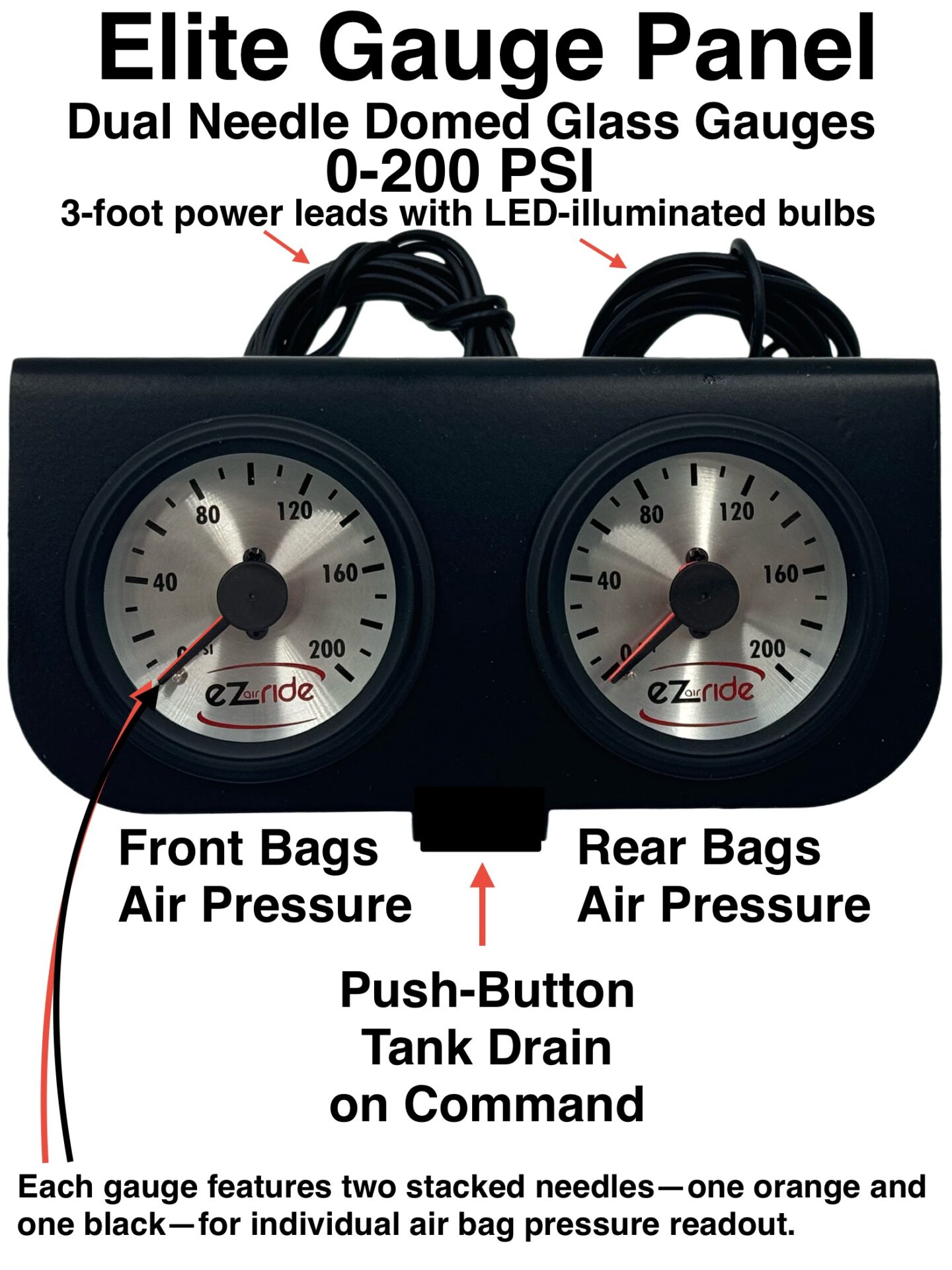 The Elite Analog Gauge Panel is for the custom builder who appreciates the timeless look of old-school mechanical needles, and gets to ditch the most frustrating part of all air ride systems all in one—and that’s crawling under the vehicle or laying in the trunk with a wrench in one hand and a rag in the other to drain the tank.